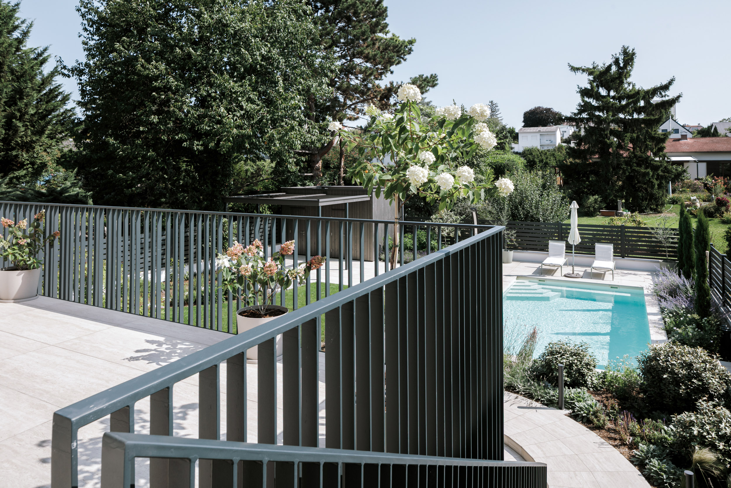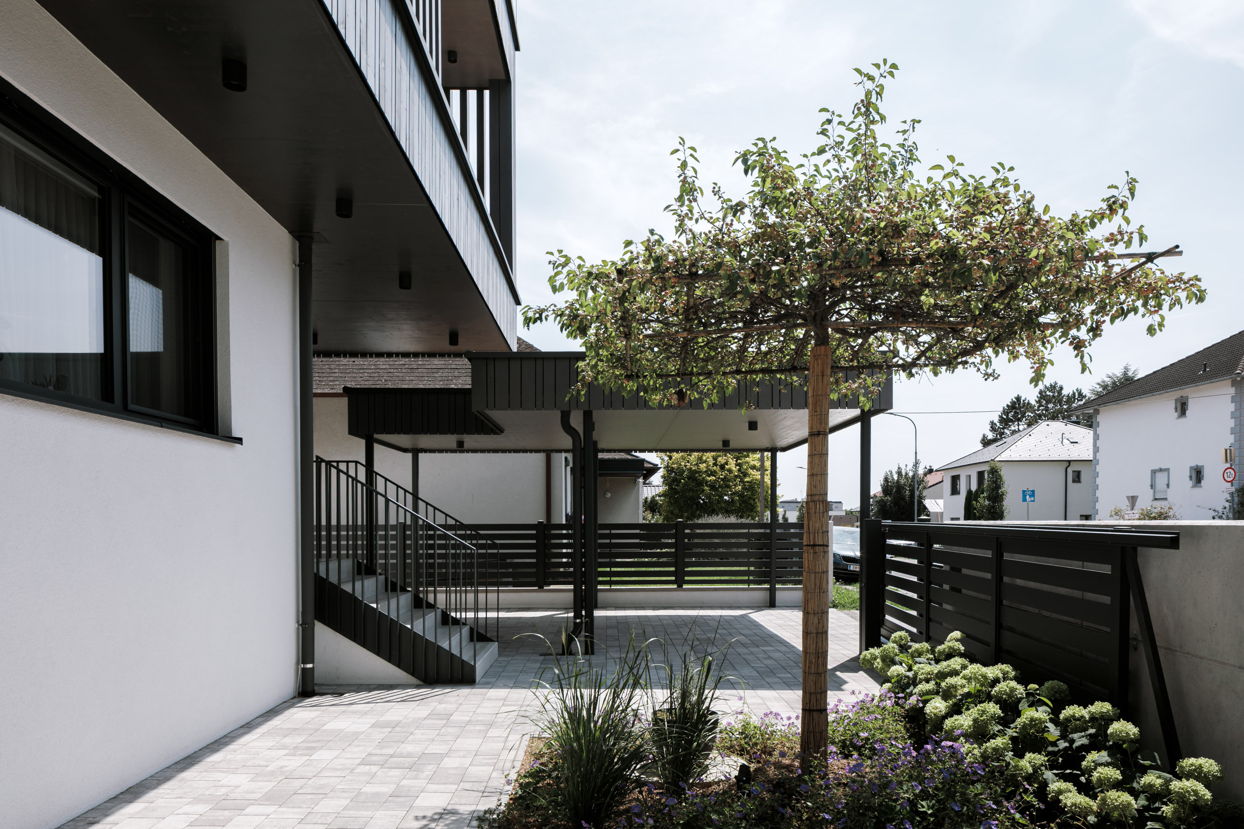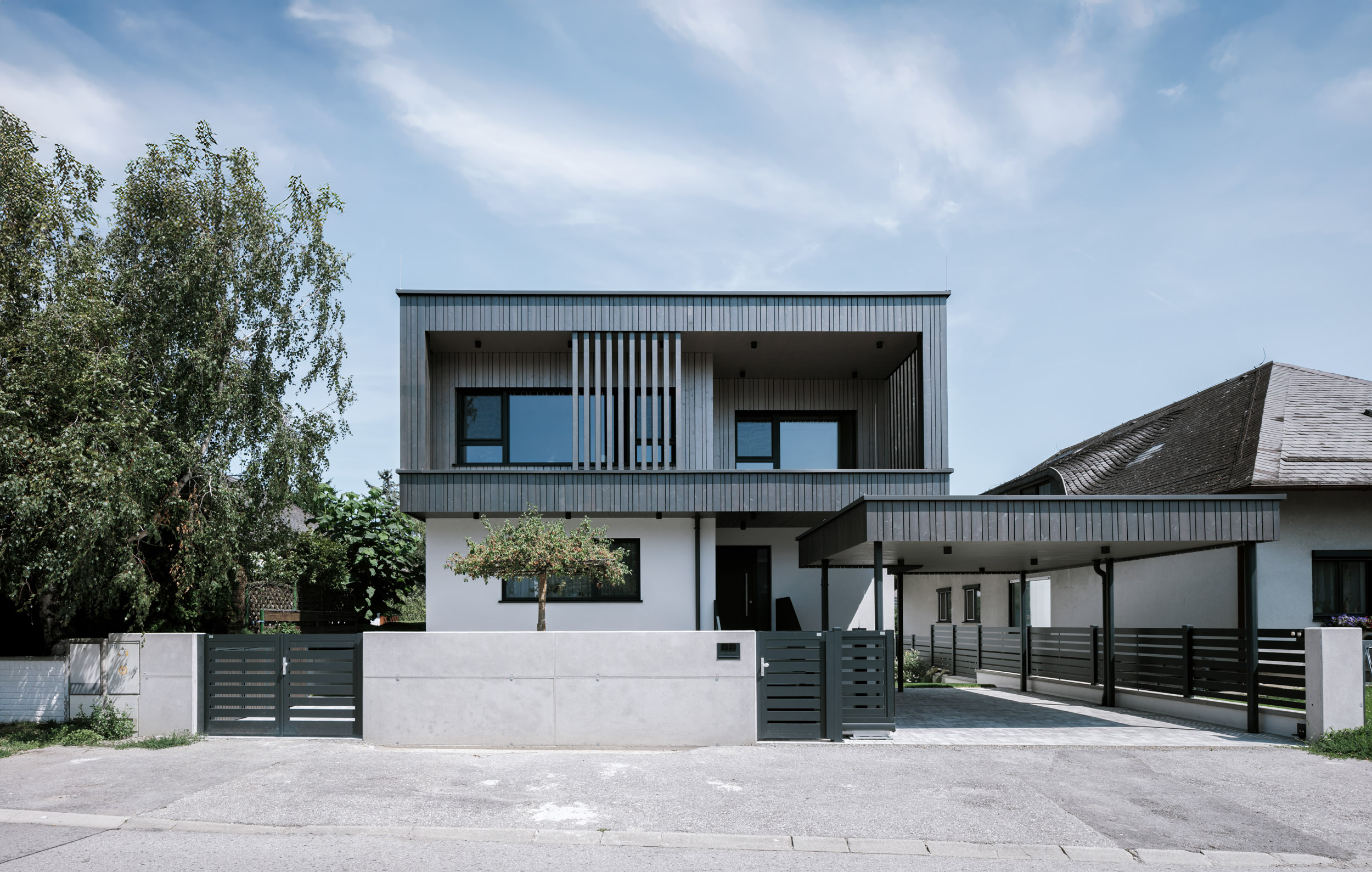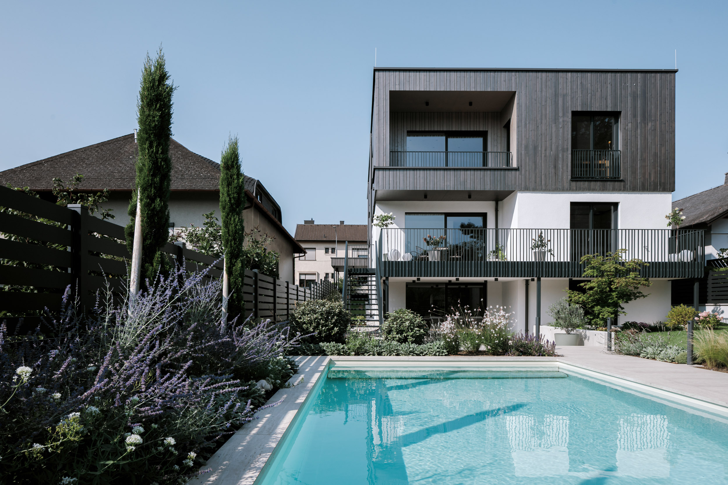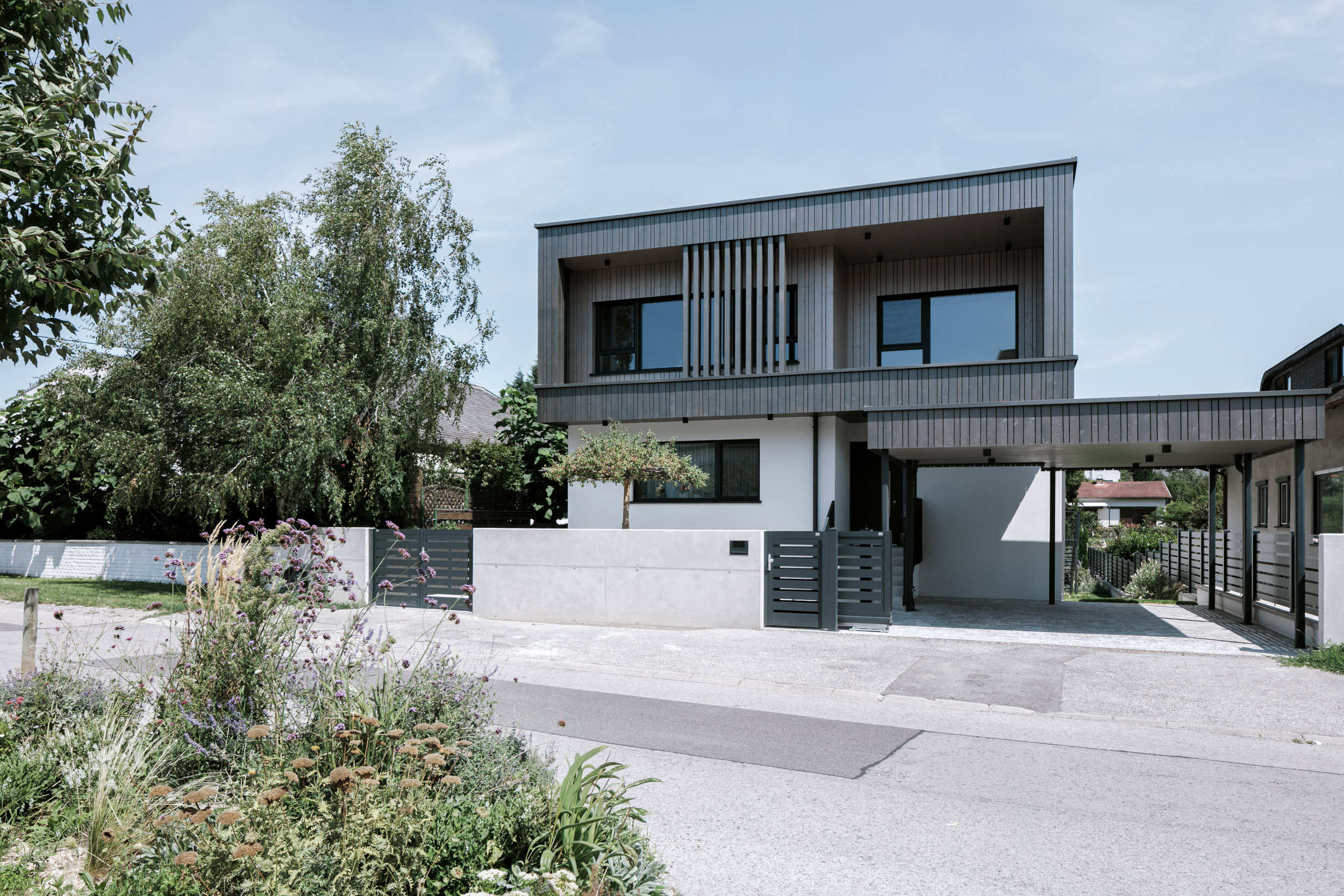 Im Außenbereich besticht die geradlinige Architektur mit ihren Details. Während das Erdgeschoß in weißem Putz erscheint, wurde das Obergeschoß mit dunkelgrauem Holz verkleidet, die in den Kubus zurückgezogenen Loggien und Terrassen erscheinen in einem Champagnerton.