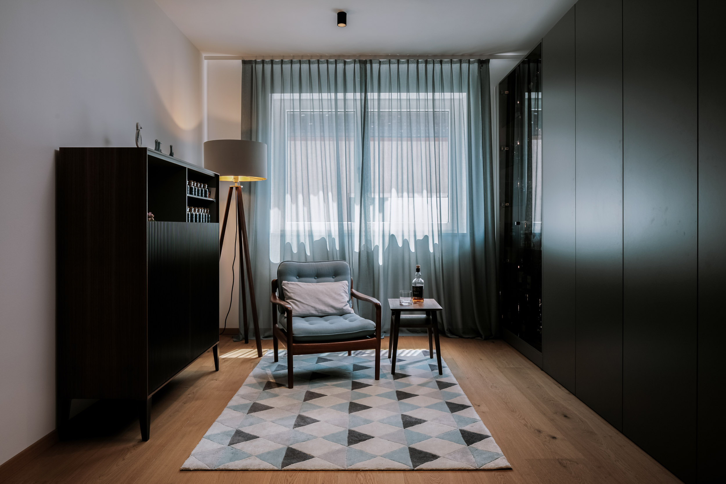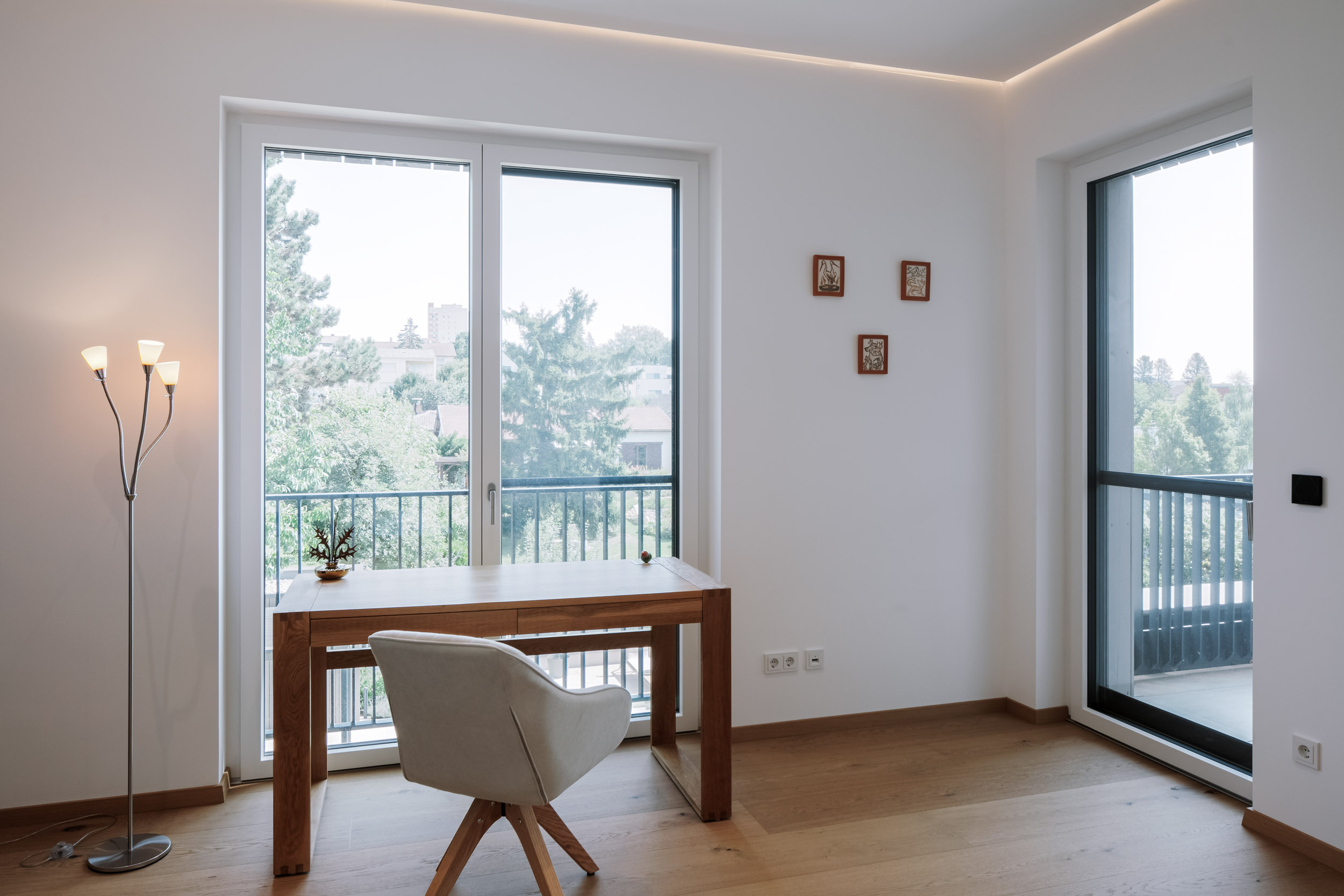 Zurückgezogen hinter ein kleines Bad zur Linken und ein Gästezimmer zur Rechten liegen die beiden, sich nach dem ruhigen Garten orientierenden Arbeitszimmer.