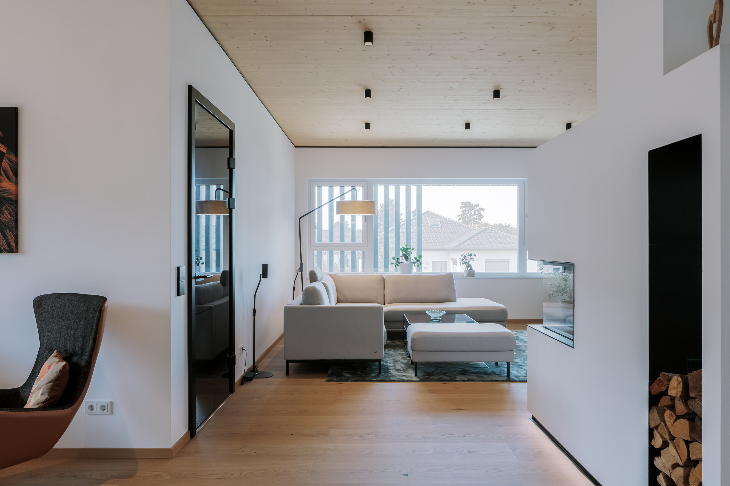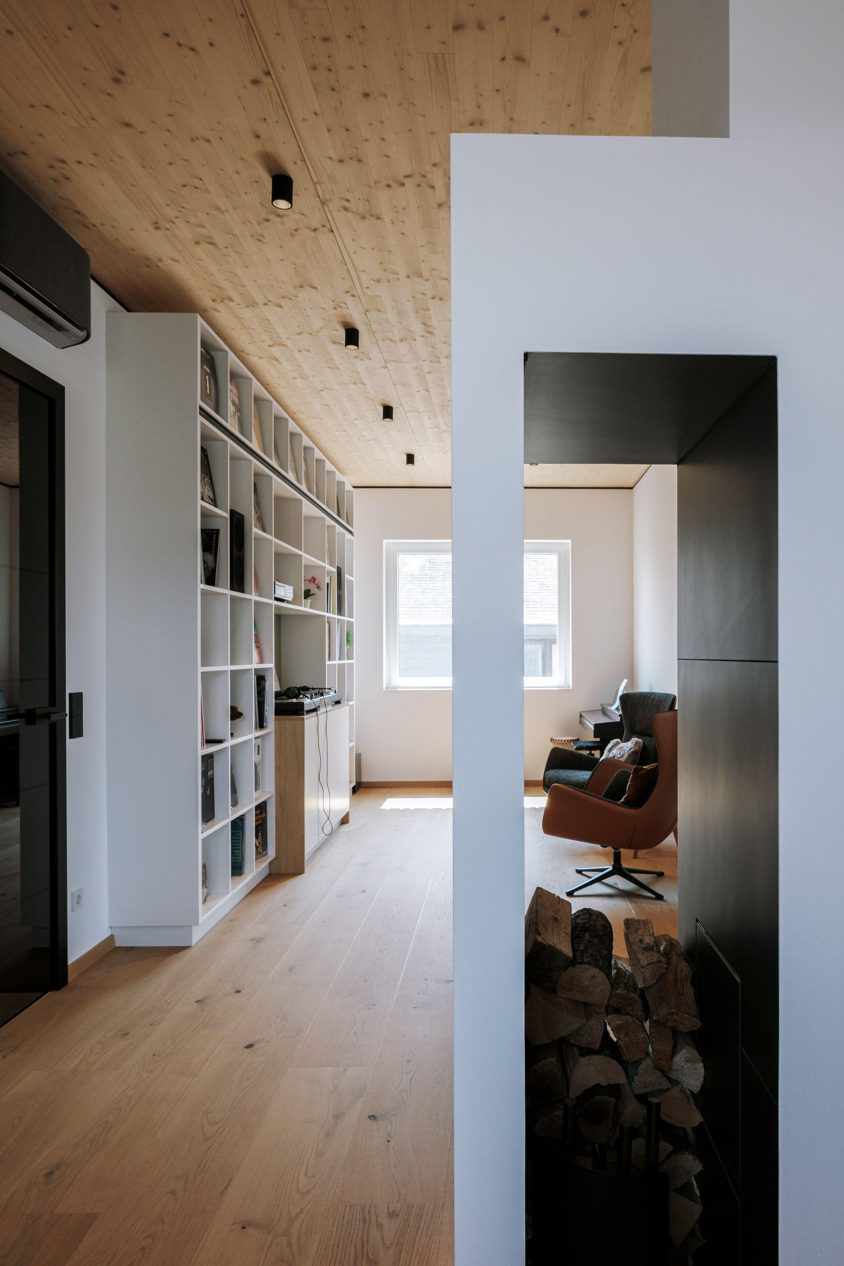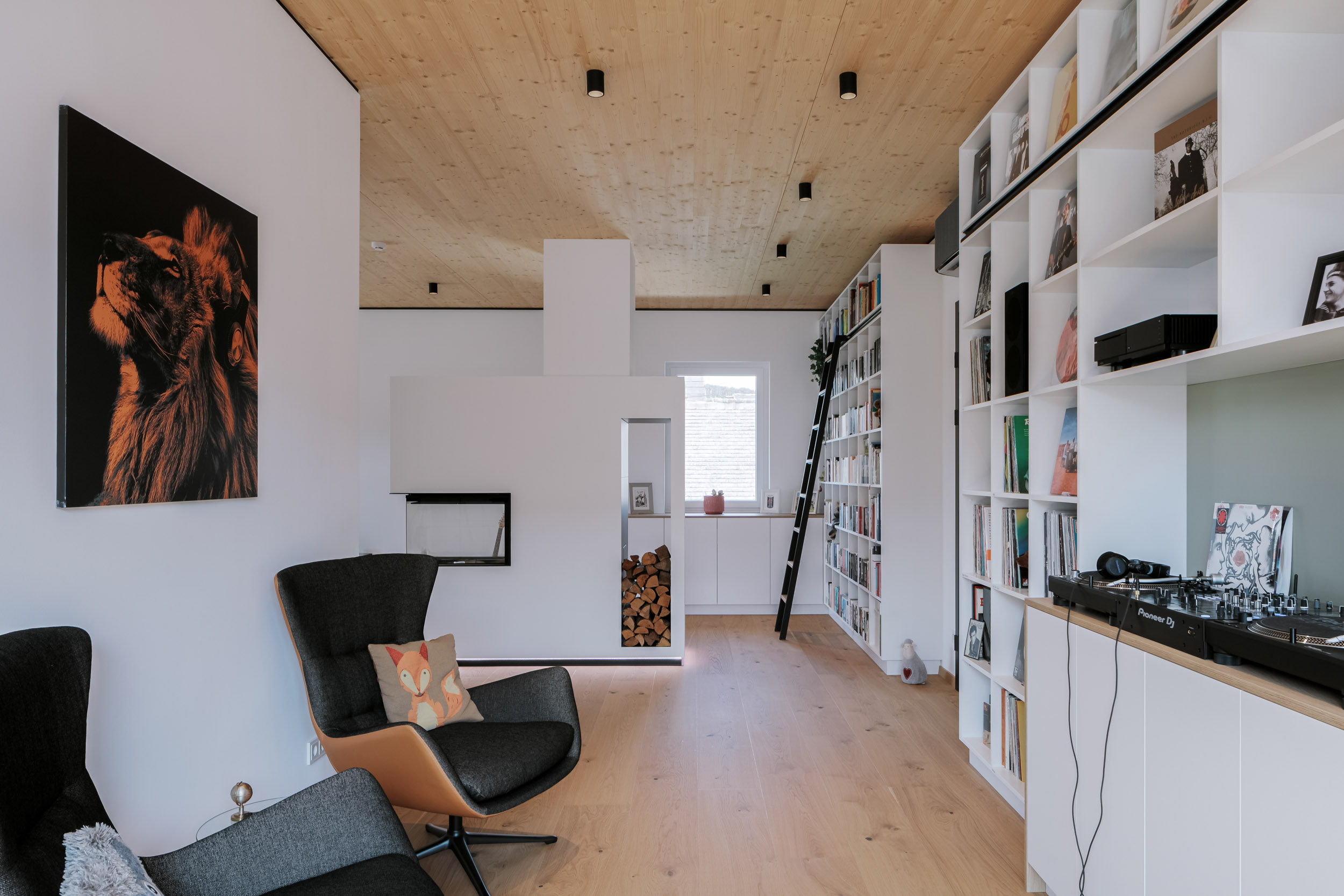 Im Obergeschoß dominiert ein großes »Lebenszimmer« mit offenem Kamin. Hier warten Bücher, Instrumente und Schallplatten, eine großzügige Couch und laden ein zum gemeinsamen Dolcefarniente.