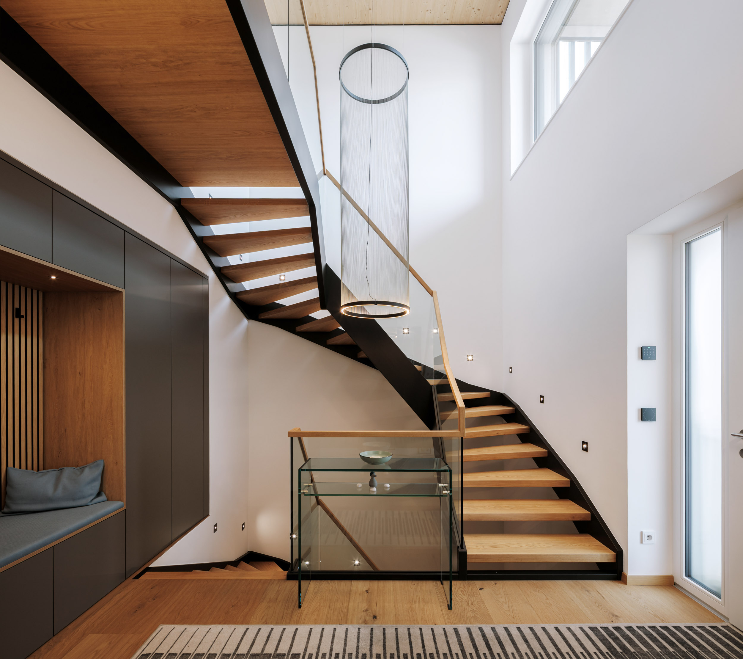 Eine künstlerisch anmutende Treppe aus schwarzem Stahl und Eichenholz führt hinauf in das oberste Geschoß.